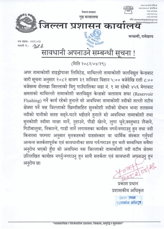 काठमाडौं । जिल्ला प्रशासन कार्यालय रामेछापले तामाकोशी नदी तटीय क्षेत्रका बासिन्दालाई विशेष सतकर्ता अपनाउन आग्रह गरेको छ।