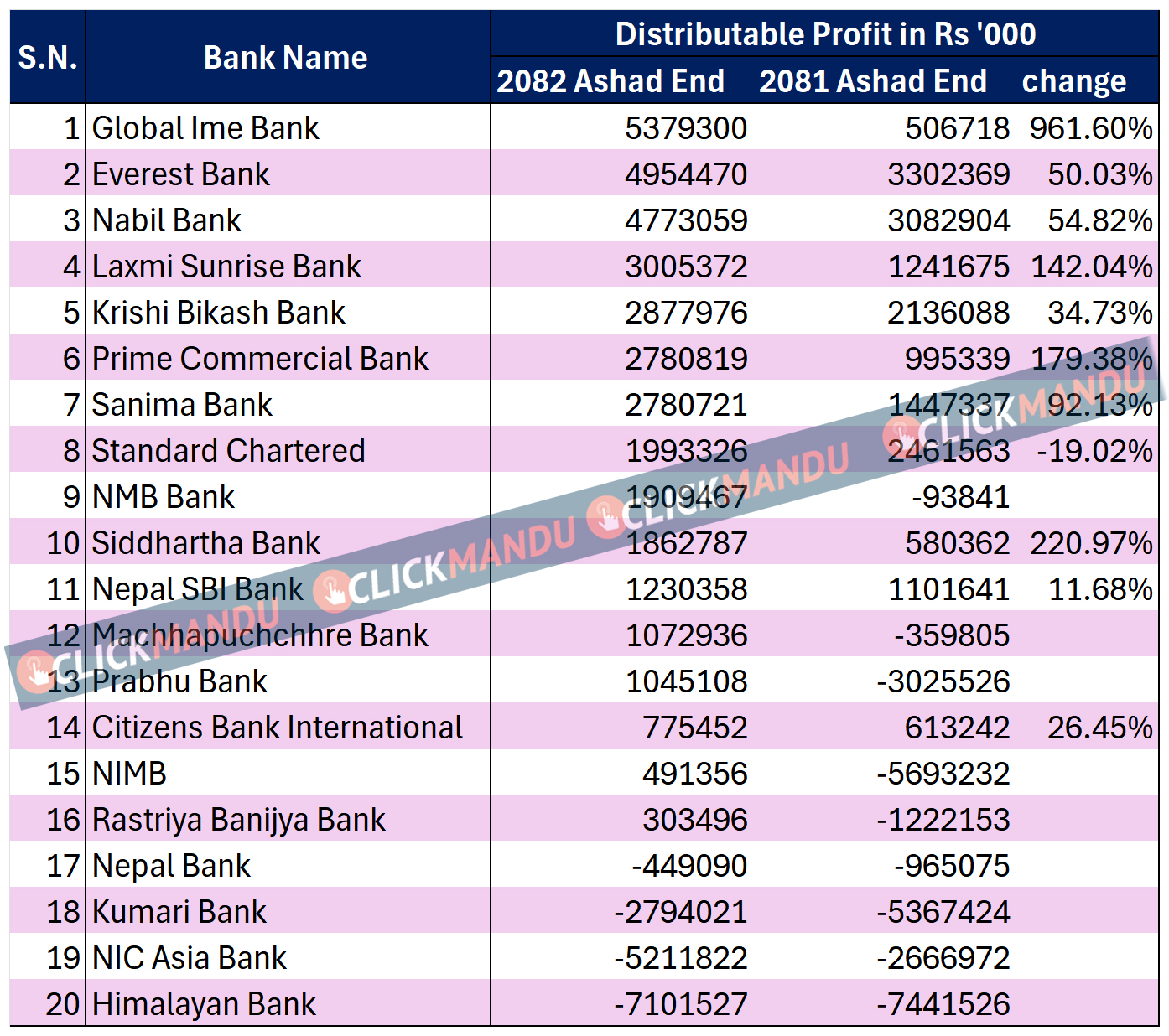 तसर्थ ७१ अर्ब ४९ करोड रूपैयाँ खुद नाफा गरे तापनि बैंकहरूले २१ अर्ब ६८ करोड रुपैयाँमात्र वितरण गर्न सक्ने देखिन्छ । वित्तीय विवरणअनुसार सबैभन्दा बढी सञ्चित नाफा वा कुल वितरणयोग्य नाफा ग्लोबल आईएमई र दोस्रो धेरै एभरेष्ट बैंकको छ ।