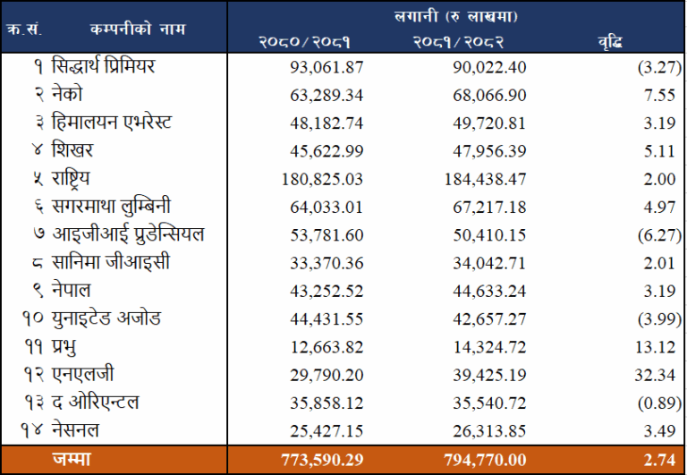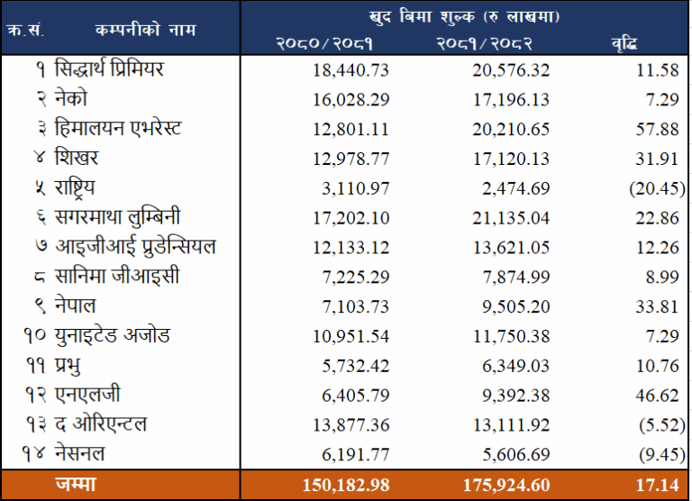 अघिल्लो आर्थिक वर्षको तुलनामा गत वर्ष हिमालयन एभरेष्ट इन्स्योरेन्सले ५७.८८ प्रतिशत बढी खुद बिमाशुल्क आर्जन गर्दा एनएलजी इन्स्योरेन्सले ४६ प्रतिशतले, नेपाल इन्स्योरेन्सले ३३ प्रतिशतले र शिखर इन्स्योरेन्सले ३१.९१ प्रतिशतले बढाए । अघिल्लो आवको तुलनामा गत आवमा राष्ट्रिय बिमा कम्पनीको खुद बिमाशुल्क संकलन २०.४५ प्रतिशतले घट्यो ।