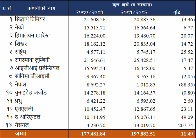 अघिल्लो आर्थिक वर्षको तुलनामा नेशनल इन्स्योरेन्स कम्पनीले २०७ प्रतिशत बढी खर्च गर्दा ओरिएन्टलले ४९.०९ प्रतिशतले, एनएलजीले २३.११ प्रतिशतले, राष्ट्रिय बिमा कम्पनीले २५.५२ प्रतिशतले र हिमालयन एभरेष्टले २०.०७ प्रतिशत बढी खर्च गरेको छ ।
