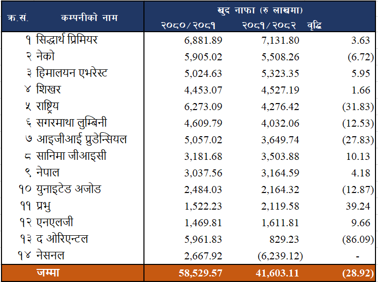 अघिल्लो आर्थिक वर्षको तुलनामा गत आर्थिक वर्ष प्रभु इन्स्योरेन्सले ३९ प्रतिशतले नाफा वृद्धि गर्यो । सानिमा जीआईसीले १०।१३ प्रतिशत र एनएलजी इन्स्योरेन्सले ९.६६ प्रतिशतले नाफा वृद्धि गर्दा अन्य चार कम्पनीमा सामान्य सुधार देखियो । अघिल्लो आवको तुलनामा गत वर्ष ओरिएन्टल इस्न्स्योरेन्सको कम्पनीको नाफा ८६ प्रतिशतले घट्दा राष्ट्रिय बिमा कम्पनीको ३१ प्रतिशतले र आईजीआई प्रुडेन्सियलको २७ प्रतिशतले घट्यो ।