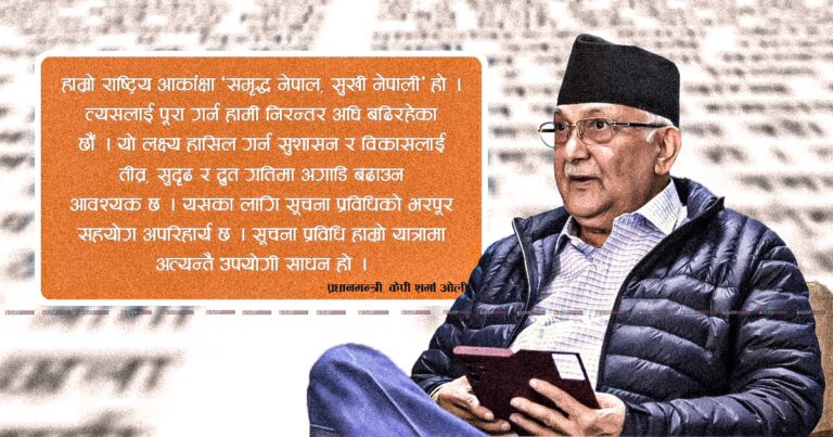 हाम्रो राष्ट्रिय आकाङ्क्षा हामीले भनेका छौं—“समृद्ध नेपाल, सुखी नेपाली” । त्यो हाम्रो राष्ट्रिय आकाङ्क्षा हो । त्यो आकाङ्क्षा परिपूर्ति गर्न, प्राप्त गर्न, गन्तव्य बनाएर हामी हिँडिरहेका छौं । त्यसको प्राप्तिका लागि सुशासन र विकासलाई तीव्रता, सुदृढता र द्रुत गतिका साथ अगाडि बढाउन जरुरी छ । त्यसमा आईटीको भरपूर मद्दत लिन जरुरी छ । यो अत्यन्त उपयोगी छ ।