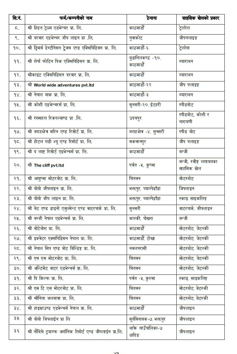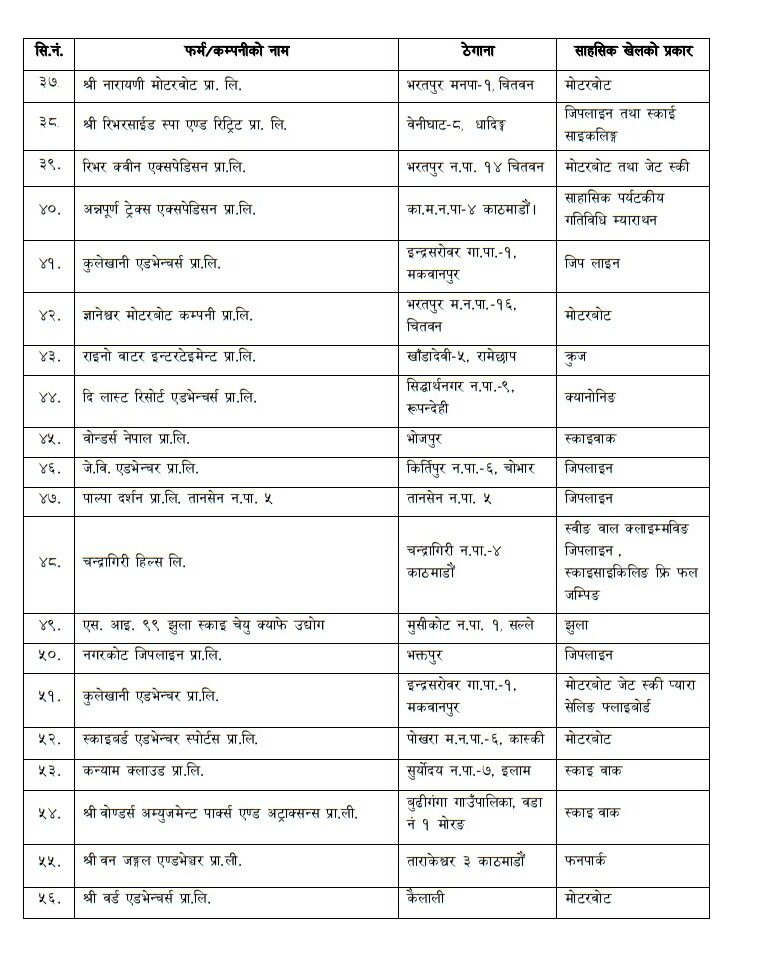 हालसम्म विभागमा दर्ता भएका साहसिक तथा मनोरञ्जनात्मक पर्यटन व्यवसायको संख्या ५६ पुगेको र अझै नयाँ नयाँले सञ्चालन अनुमति माग्ने काम रोकिएको छैन् । विभागमा साहसिक पर्यटकीय गतिविधि गर्न रुचाउने र सेवा सञ्चालनको रुची देखाएर आउने सेवाग्राहीको चाप बढ्दै गएको छ । विभागका अनुसार गत आर्थिक वर्ष २०८१/८२ मा मात्रै ५ व्यवसायले थपिएका छन ।