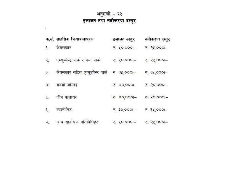विभागले तोकेको नवीकरण दस्तुर अनुसार एमुजमेन्ट पार्कलाई ५० हजार, केबलबारसहितको एमुज्मेन्ट पार्कलाई ५० हजार, केवलकारसतिको पार्कलाई ७५ हजार इजाजत शुल्क तोकिएको छ । बन्जी जम्पिङ र जीप फ्लायरलाई ५० हजार, क्यानोनिङलाई ३० हजार र अन्य साहिक गतिविधिलाई ५० हजार रुपैयाँ इजाजत शुल्क तोकिएको छ । इजाजत शुल्कले हुन आउने ५० प्रतिशत रकम नवीकरणको लागि लाग्ने व्यवस्था गरिएको छ ।