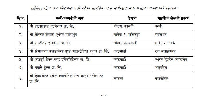 पर्यटन एनेले साहसिक पर्यटनलाई दर्ता, नवीकरण निलम्बन गर्ने व्यवस्था तोकिए बमोजिम हुने व्यवस्था गरेको छ । तर हालसम्म साहसिक पर्यटन सम्बन्धि नियमावली बन्न नसकेकोको अवस्थामा समेत विभागमा ५६ वटा साहसिक तथा मनोरन्जनात्मक पर्यटन व्यवसाय दर्ता भएका छन् ।
