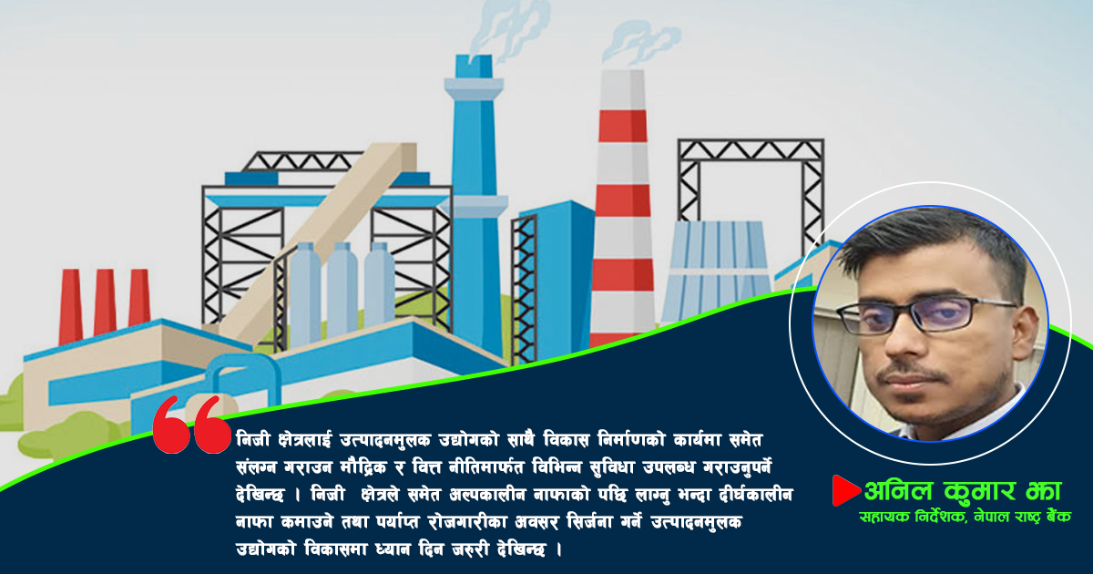 तर, पछिल्लो समय नेपालको निजी क्षेत्र समेत उत्पादनमुलक उद्योग भन्दा व्यापारमुलक उद्योगमा आकर्षित भएकोले पर्याप्त रोजगारीको अवसर सिर्जना गर्न सकिएको छैन । त्यसर्थ, निजी क्षेत्रलाई उत्पादनमुलक उद्योगको साथै विकास निर्माणको कार्यमा समेत संलग्न गराउन मौद्रिक र वित्त निती मार्फत विभिन्न सुविधा उपलब्ध गराउनुपर्ने देखिन्छ । निजी क्षेत्रले समेत अल्पकालिन नाफाको पछि लाग्नु भन्दा दीर्घकालीन नाफा कमाउने तथा पर्याप्त रोजगारीका अवसरहरु सिर्जना गर्ने उत्पादनमुलक उद्योगको विकासमा ध्यान दिन जरुरी देखिन्छ ।