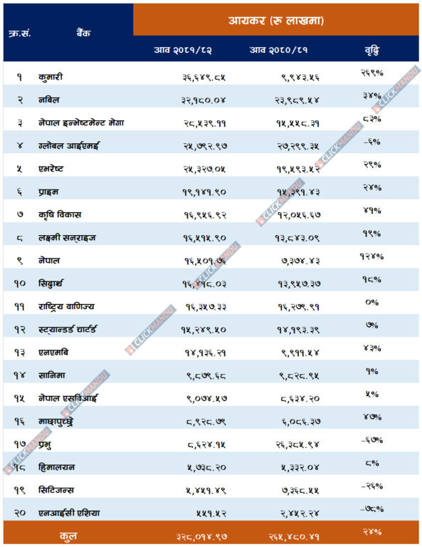 आर्थिक वर्ष २०८०/८१ मा सरकारले कुल २ खर्ब ४६ अर्ब ६२ करोड ६१ लाख रुपैयाँ आयकर संकलन गरेकामा त्यसको १०.७६ प्रतिशत अर्थात् २६ अर्ब ५४ करोड ८० लाख रुपैयाँ आयकर २० वाणिज्य बैंकहरुले तिरेका थिए ।
