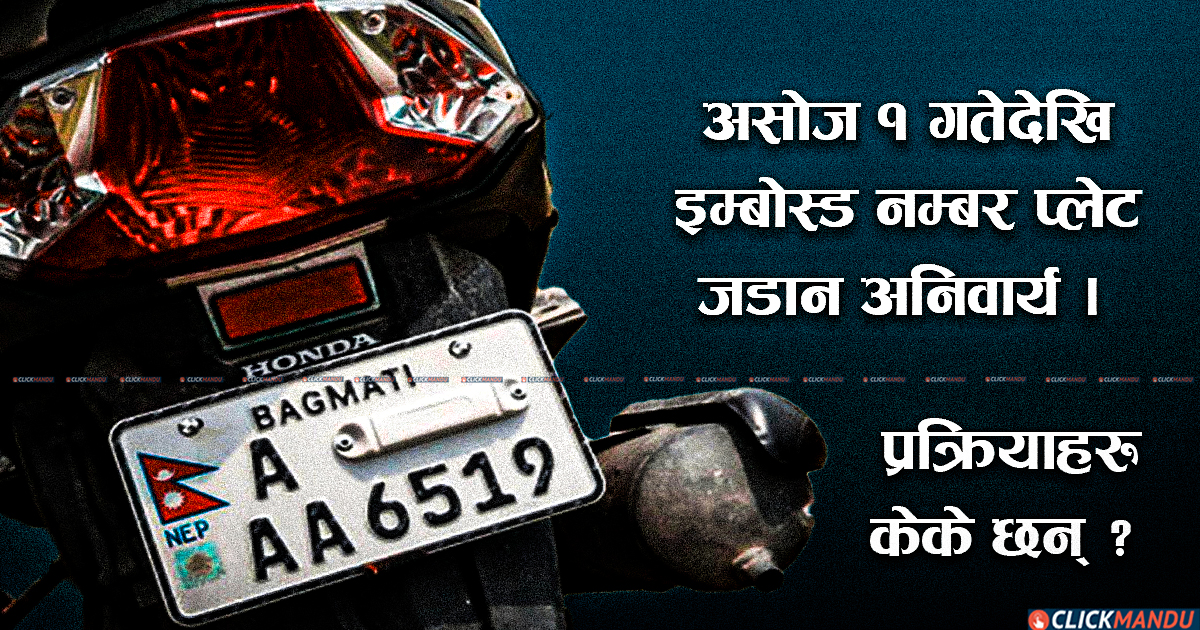 सरकारले असोज १ गतेदेखि सबै सवारी साधनमा इम्बोस्ड नम्बर प्लेट अनिवार्य जडान गर्नु पर्ने निर्देशन दिइसकेको छ । अन्यथा कारबाही गरिने चेतावनी समेत दिएको छ । तर सवारीधनी भने इम्बोस्ड नम्बर प्लेटको दस्तुर भने महँगो भएको, इम्बोस्ड नम्बर प्लेट कमसल भएको भन्दै चर्को विरोध गरिरहेका छन् ।