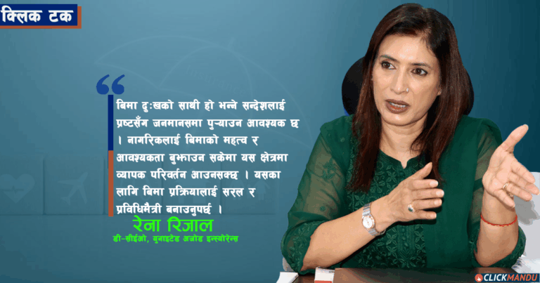 यहि सन्दर्भमा, नेपालको वर्तमान बिमा अवस्था, समस्या, राज्यले लिनुपर्ने नीति र आगामी दिनमा बिमा कम्पनी तथा नियामकले समात्नुपर्ने बाटोका विषयमा केन्द्रीत रहेर युनाइटेड अजोड इन्स्योरेन्सका नायब–प्रमुख कार्यकारी अधिकृत (डी–सीईओ) रेना रिजालसँग क्लिकमान्डुका पदम भुजेलले गरेको कुराकानीको सम्पादीत अंशः