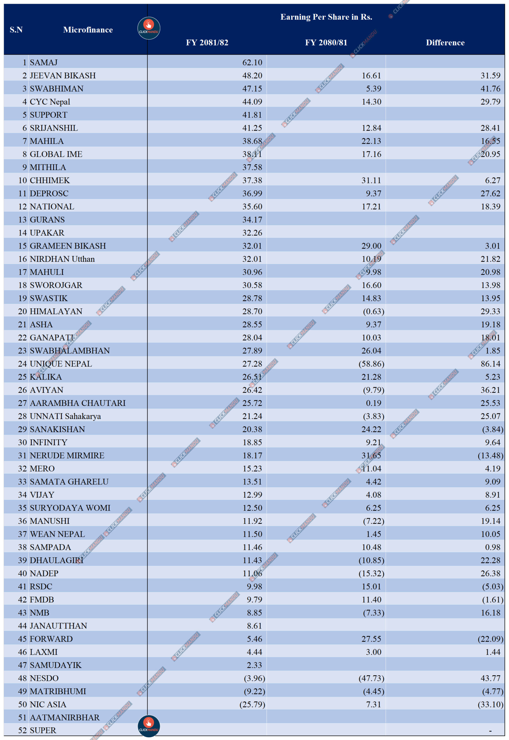 नाफा बढेसँगै अधिकांश लघुवित्तको प्रतिसेयर आम्दानी पनि बढेको छ । सबैभन्दा धेरै प्रतिसेयर आम्दानी समाज लघुवित्तको ६२ रुपैयाँ १० पैसा छ । जीवन विकास लघुवित्तको ४८ रुपैयाँ २० पैसा, स्वाभिमान लघुवित्तको ४७ रुपैयाँ १५ पैसा, सिभाइस नेपाल लघुवित्तको ४४ रुपैयाँ ९ पैसा छ ।