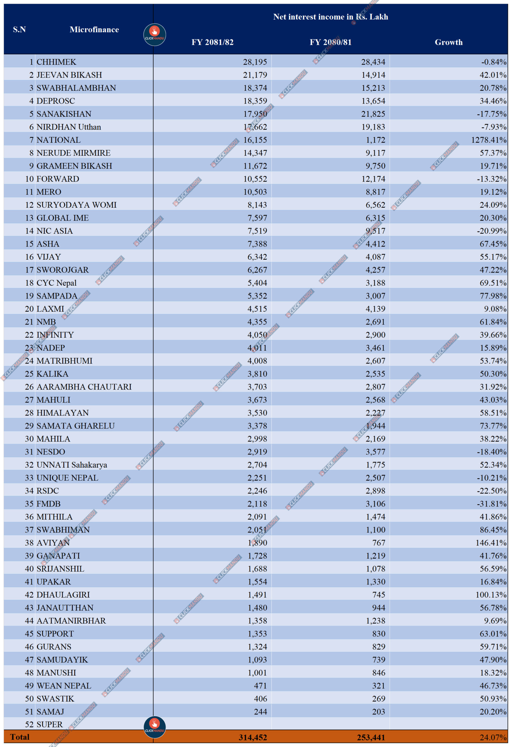 गत आर्थिक वर्षमा छिमेक लघुवित्तको खुद ब्याज आम्दानी ०.८४ प्रतिशतले घटेर २ अर्ब ८१ करोड ९५ लाख रुपैयाँमा झरेको छ । जीवन विकास लघुवित्तको खुद ब्याज आम्दानी ४२.०१ प्रतिशतले बढेर २ अर्ब ११ करोड ७९ लाख रुपैयाँ पुगेको छ । स्वावलम्बन लघुवित्तको खुद ब्याज आम्दानी २०.७८ प्रतिशतले बढेर १ अर्ब ८३ करोड ७४ लाख, डेप्रोक्स लघुवित्तको खुद ब्याज आम्दानी २४.४६ प्रतिशतले बढेर १ अर्ब ८३ करोड ५९ लाख रुपैयाँ पुगेको छ ।
