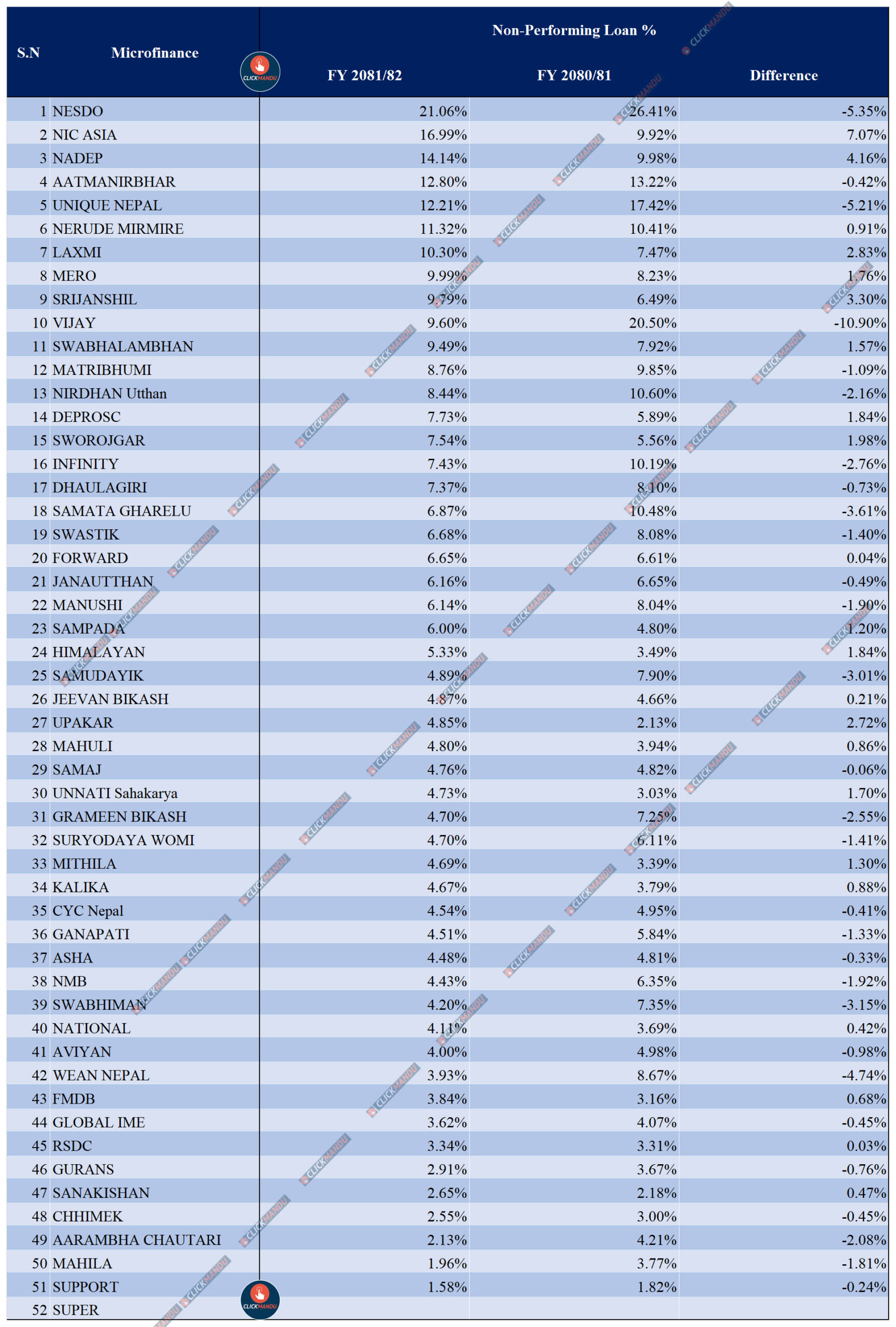 ७ लघुवित्तको निष्क्रिय कर्जा दोहोरो अंकमा पुगेको छ । नेस्डो समृद्धि लघुवित्तको निष्क्रिय कर्जा २१.०६ प्रतिशत, एनआईसी एशिया लघुवित्त १६.९९ प्रतिशत, नाडेप लघुवित्त १४.१४ प्रतिशत, आत्मनिर्भर लघुवित्त १२.८० प्रतिशत, युनिक नेपाल लघुवित्त १२.२१ प्रतिशत, नेरुडे मिर्मिरे लघुवित्त ११.३२ प्रतिशत र लक्ष्मी लघुवित्त १०.३० प्रतिशत पुगेको छ ।