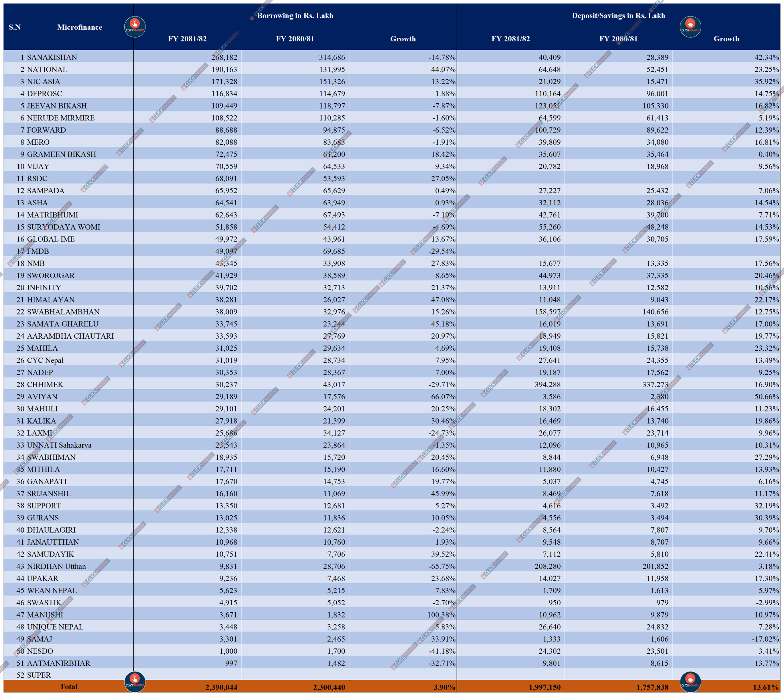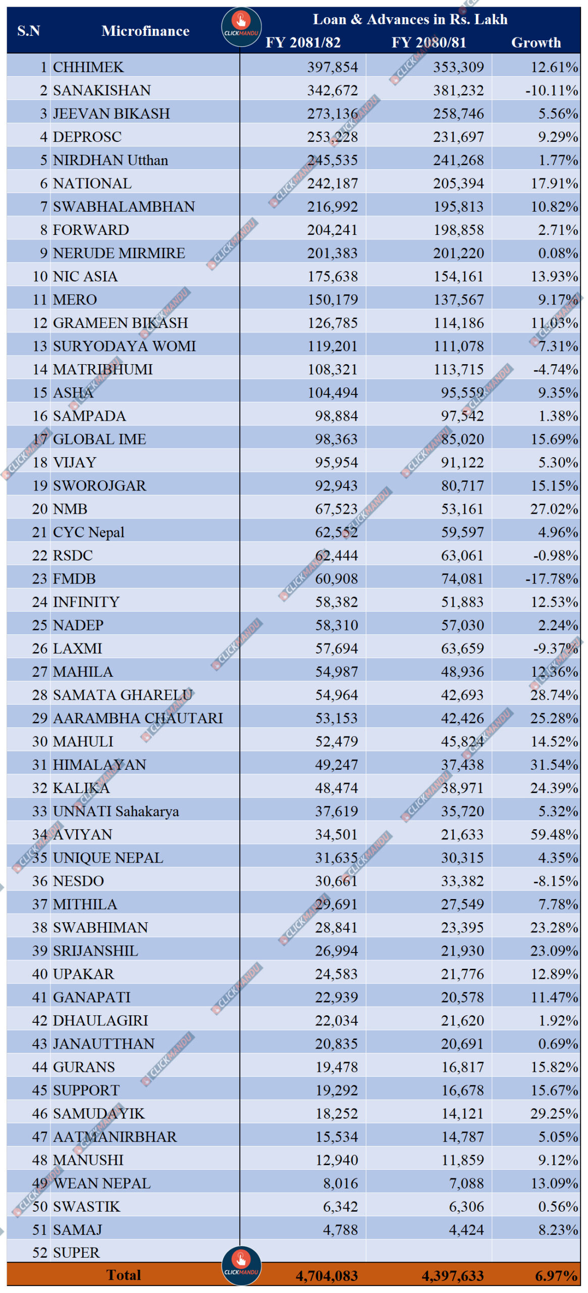 गत आर्थिक वर्षसम्म आउँदा कर्जा लगानीमा छिमेक अगाडि रहेको छ भने साना किसान दोस्रो र जीवन विकास लघुवित्त तेस्रो स्थानमा छन् । छिमेकको कर्जा लगानी १२.६१ प्रतिशतले बढेर ३९ अर्ब ७९ करोड रुपैयाँ पुगेको छ । लघुवित्तले ३९ अर्ब ४३ करोड बचत संकलन र ३ अर्ब सापटी लिएको छ । लघुवित्तको बचत १६.९० प्रतिशतले बढेको छ भने सापटी २९.७१ प्रतिशतले घटेको छ ।