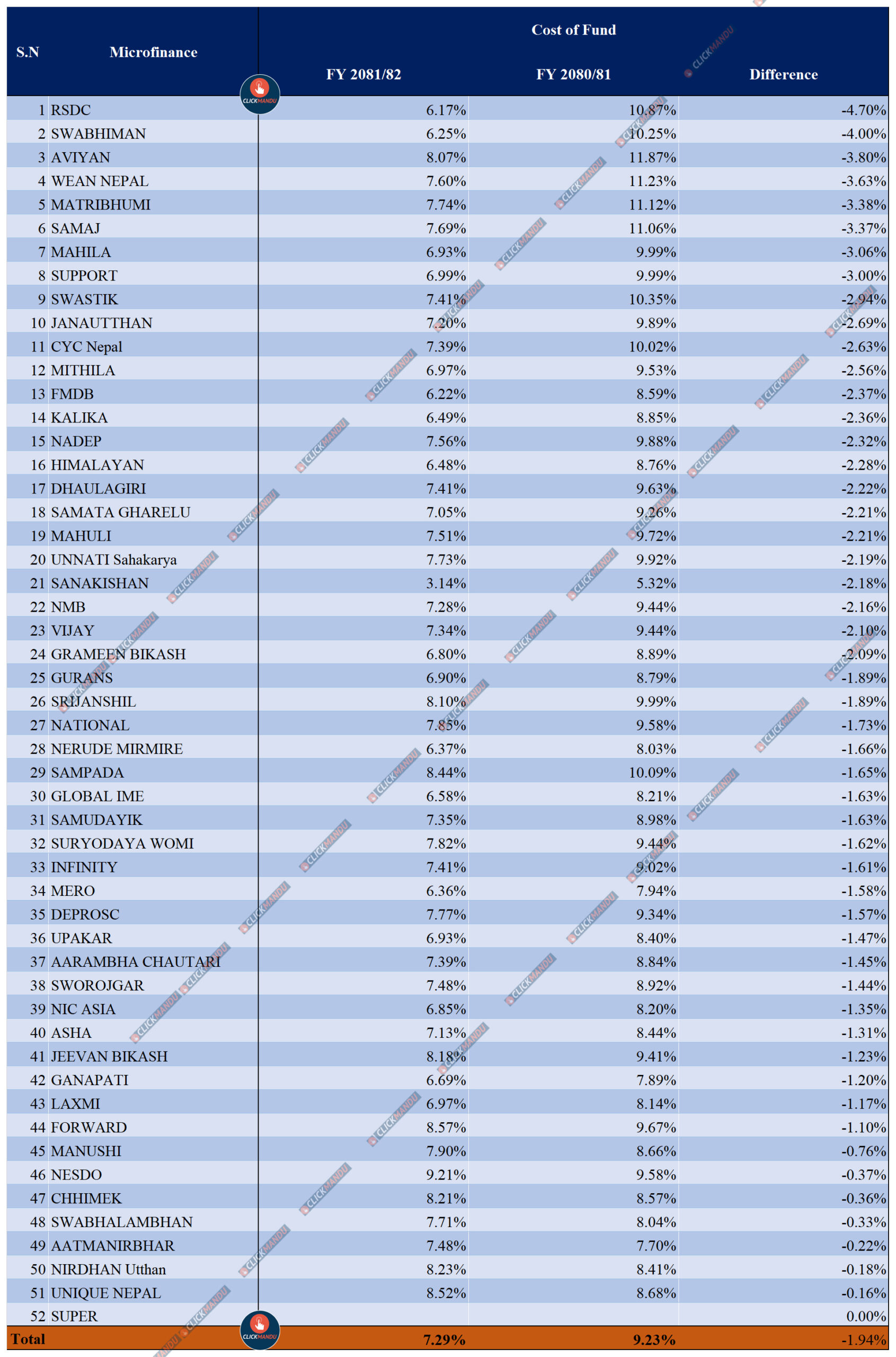 सर्वोच्च रूपमा सबै लघुवित्तको कोषको लागत घटेको छ । साना विकासन लघुवित्तको कोषको लागत ३.१४ प्रतिशत, आरएसडिसी लघुवित्त ६.१७ प्रतिशत, फस्ट माइक्रोफाइनान्स ६.२२ प्रतिशत, स्वाभिमान लघुवित्त ६.२५ प्रतिशत, मेरो माइक्रोफाइनान्स ६.३६ प्रतिशत, नेरुडे मिर्मिरे ६.३६ प्रतिशत, नेस्डो समृद्धि ९.२१ प्रतिशत, फर्वार्ड ८.५७ प्रतिशत, युनिक नेपाल ८.५२ प्रतिशत, सम्पदा ८.४४ प्रतिशत, निर्धन उत्थान ८.२३ प्रतिशत, छिमेक ८.२१ प्रतिशत र जीवन विकास ८.१८ प्रतिशत रहेको छ ।
