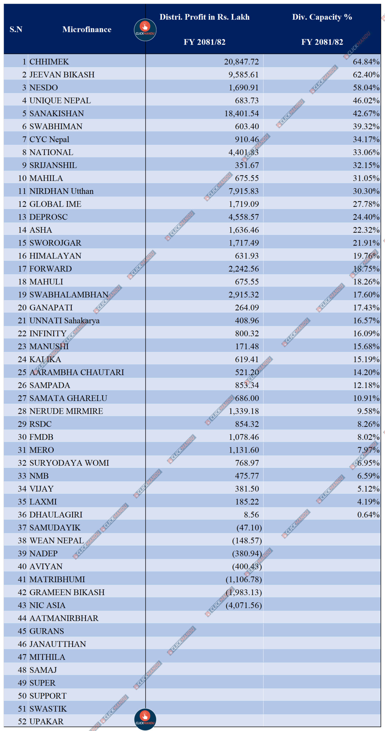 वितरणयोग्य नाफा सबैभन्दा धेरै २ अर्ब ८ करोड ४८ लाख रुपैयाँ छ । साना किसान लघुवित्तको वितरणयोग्य नाफा १ अर्ब ८४ करोड, जीवन विकास लघुवित्तको ९५ करोड ८६ लाख र निर्धन उत्थान लघुवित्तको ७९ करोड १६ लाख रुपैयाँ छ ।