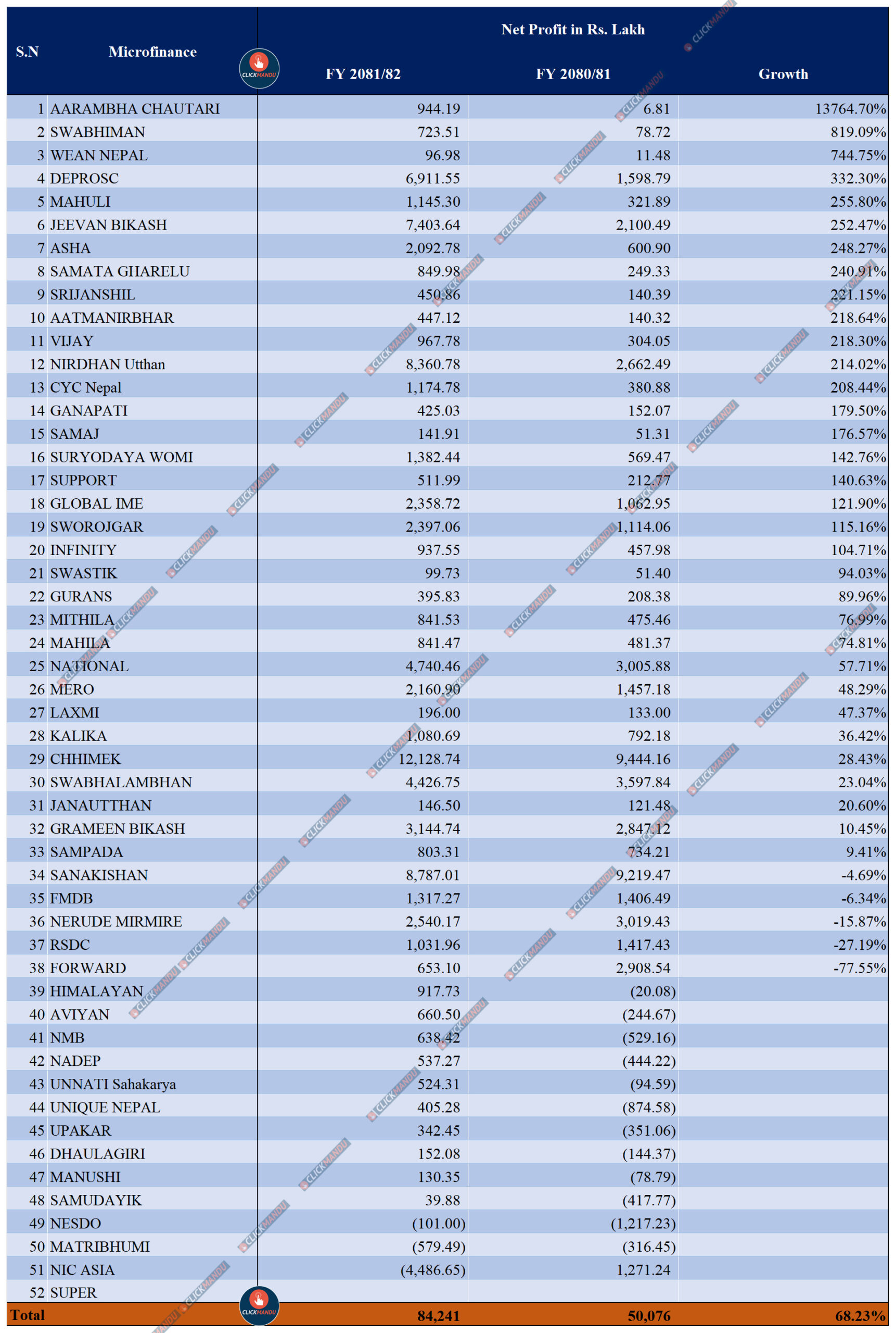 ५१ लघुवित्तको नाफा गत आर्थिक वर्ष २०८१/८२ मा ६८.२३ प्रतिशतले वृद्धि भएर ८ अर्ब ४२ करोड ४१ लाख रुपैयाँ पुगेको छ । अघिल्लो आर्थिक वर्षको सोही अवधिमा लघुवित्तहरूको नाफा ५ अर्ब ७६ लाख रुपैयाँ थियो।