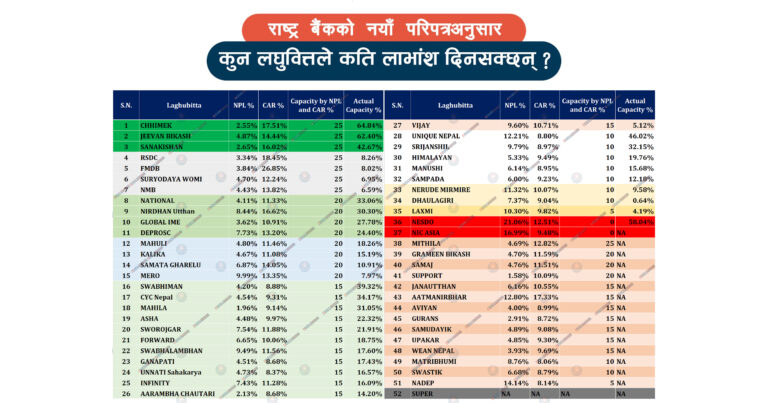 काठमाडौं । नेपाल राष्ट्र बैंकले लाभांश नीति परिमार्जन गरेसँगै ३ लघुवित्तले २५ प्रतिशत लााभांश वितरण गर्नसक्ने देखिएको छ । पुँजीकोष १२ प्रतिशतभन्दा माथि तथा निष्क्रिय कर्जा ५ प्रतिशतभन्दा कम भएका लघुवित्त ७ वटा भएपनि गत आर्थिक वर्षसम्म कायम सञ्चित मुनाफाका आधारमा ३ लघुवित्तले मात्तै २५ प्रतिशत लाभांश वितरण गर्न सक्ने देखिएका हुन् । छिमेक, जीवन … Continue reading ३ लघुवित्तले २५% लाभांश बाँड्न सक्दा ४ वटाले २०%, कम्तिमा ४ वटाले लगानीकर्ताको हात रित्तो पार्दै