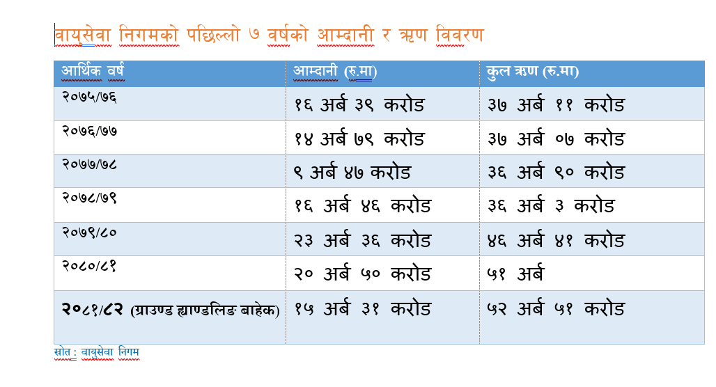 निगमले २०७५/७६ मा १६ अर्ब ३९ करोड आम्दानी हुँदा यसको ऋण दायित्व ३७ अर्ब ११ करोड थियो । त्यसपछिका चार वर्ष निगमले आम्दानी १६ अर्ब रुपैयाँबाट बढाउन नसक्दासमेत ऋण भने ३६ अर्बमै सिमित राख्न सकेको थियो ।
