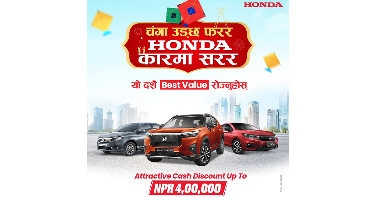 यसबाहेक, ग्राहकहरूले हरेक गाडीको खरिदमा निःशुल्क एसेसरिज, २ वर्षको इन्जिन वारेन्टी र एक पटकको लागि निःशुल्क रोडसाइड असिस्टेन्स जस्ता थप सुविधा पनि प्राप्त गर्नेछन् । यी सबै अफरहरूले ग्राहकहरूलाई होन्डा गाडीको स्वामित्व ग्रहण गर्दा पूर्ण मानसिक शान्ति र उत्कृष्ट अनुभव प्रदान गर्ने कम्पनीले विश्वास लिएको छ । यो योजना होन्डाका लोकप्रिय मोडेलहरू जस्तै होन्डा सिटी, सिटी ईःएचईभी, एलिवेट, अमेज, र सिटी फिफ्थ जेनेरेसन लगायतका गाडीहरूमा उपलब्ध हुनेछ ।