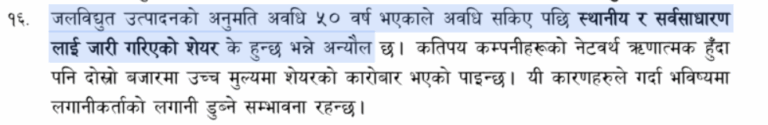 पछिल्लो समय बुट मोडलका (निश्चित आयु जस्तैः २५ वा ३० वर्ष अवधि भएका) कम्पनीको परियोजना सम्झौता अवधि पूरा भएर सरकारको स्वामित्वमा गएपछि त्यसमा रहेको सर्वसाधारण र स्थानीय लगानीकर्ताको सेयर के हुने भन्ने अन्यौलतालाई नीतिगत रुपमा स्पष्ट पार्नुपर्ने आवाज उठ्दै आएको छ ।