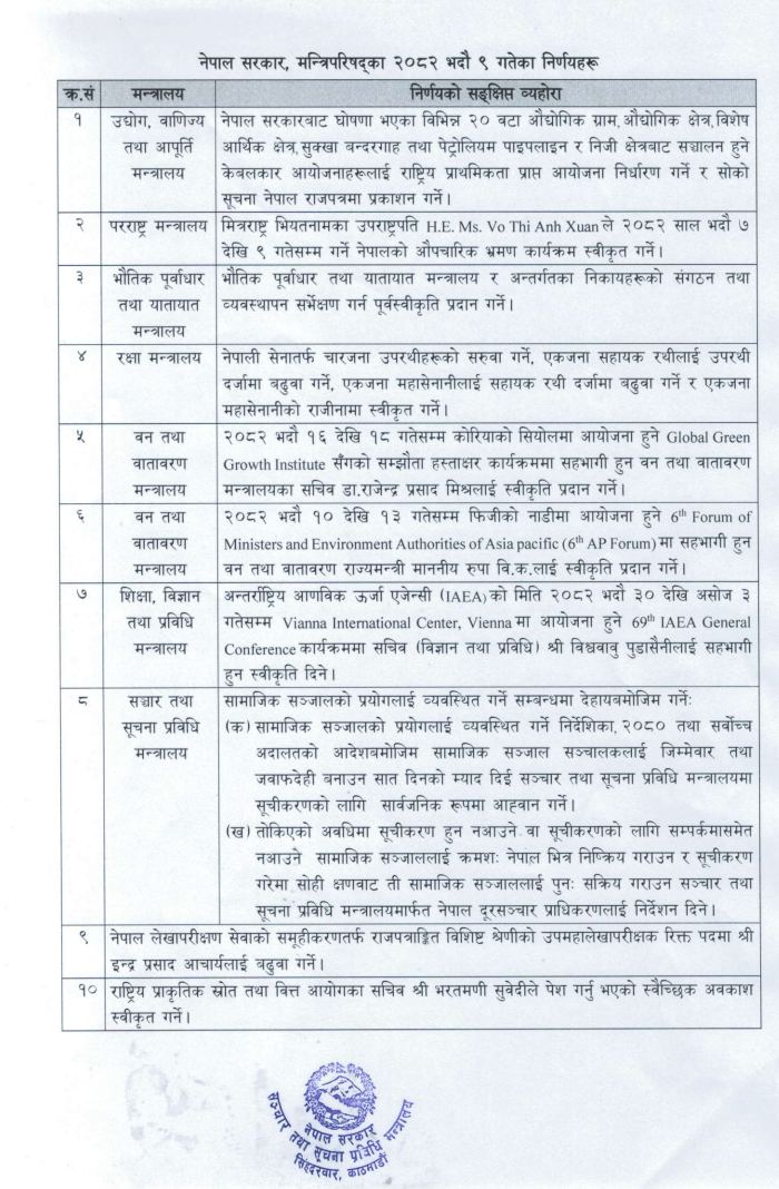 भदौ ९ गते बसेको मन्त्रिपरिषदको बैठकले राष्ट्रिय प्राथमिकता प्राप्त आयोजनाको मान्यता दिने विषयमा नेपाल राजपत्रमा प्रकाशन गर्ने भएको छ ।