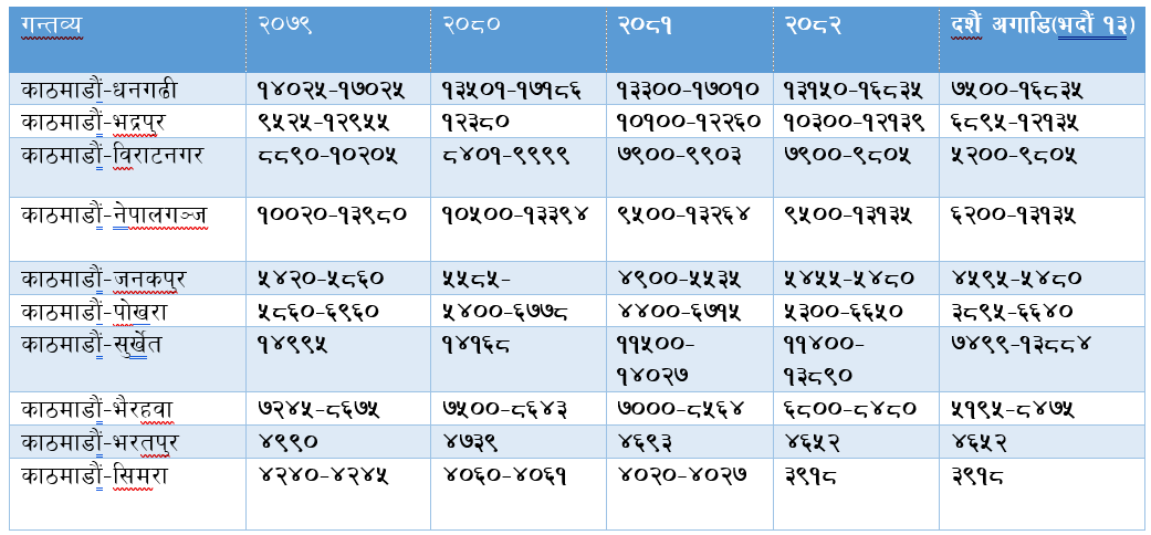 यो वर्ष दशैंलाई पनि अहिलेको सामान्य अवस्थाको तुलनामा न्यूनतम भाडामै साढे ५ हजार रुपैयाँसम्म हवाई भाडा महँगो भएको छ । वायुसेवा कम्पनीले यात्रुको चाप कम हुने र सामान्य अवस्थाका लागि दिने गरेको सस्ता टिकट वर्षेनी दशैंको बेला दिँँदैनन् ।