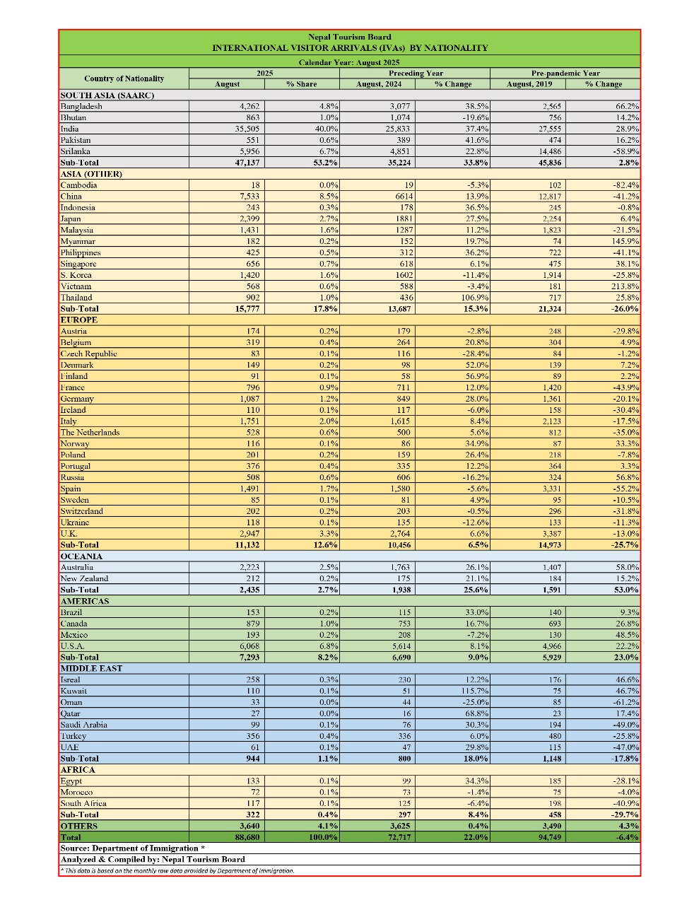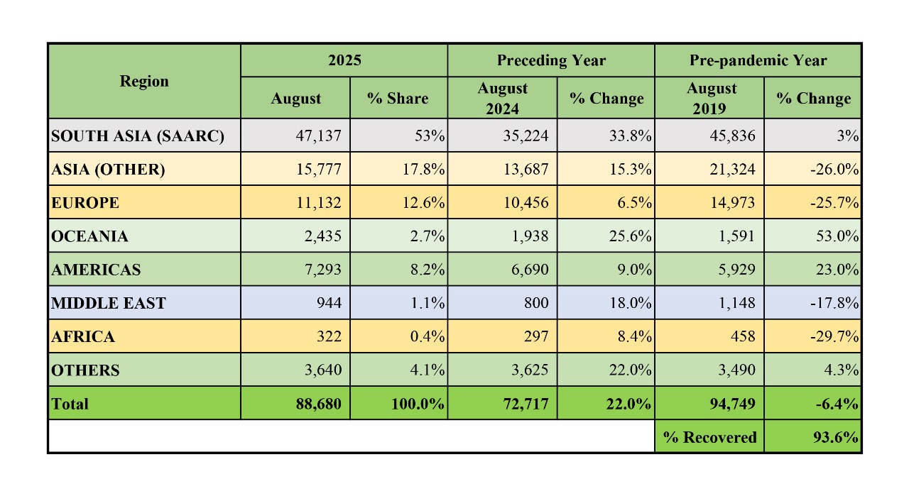सन् २०२५ को जनवरीदेखि अगस्तसम्म ८ महिनाको अवधिमा सात लाद ३६ हजार ५६२ पर्यटक भित्रिएका छन् । बोर्डले सार्वजनिक गरेको तथ्यांक अनुसार क्षेत्रगत रुपमा हेर्दा दक्षिण एसियाली (सार्क) मुलकबाट ४७ हजार १३७ पर्यटक अर्थात ५३ प्रतिशत आगमन भएको देखिन्छ भने एसियाका अन्य मुलुकमा १५ हजार ७७७ अर्थात् १७.८ प्रतिशत, युरोपबाट ११ हजार १३२ अर्थात १२.६ प्रतिशत र ओसनियाबाट २ हजार ४३५ अर्थात २.७ प्रतिशत पर्यटक भित्रिएका छन् ।