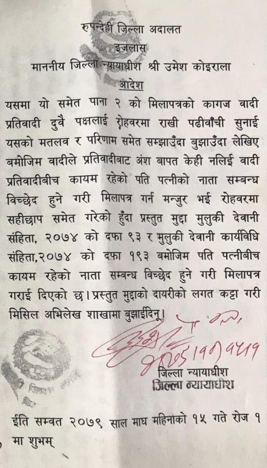 थापाले २०७९ माघ १५ गते जिल्ला अदालत रुपन्देहीमा न्यायाधीश उमेश कोइरालाको इजलासमा सम्बन्धविच्छेद गरी मिलापत्र भएको कागज सार्वजनिक गरेका हुन् ।