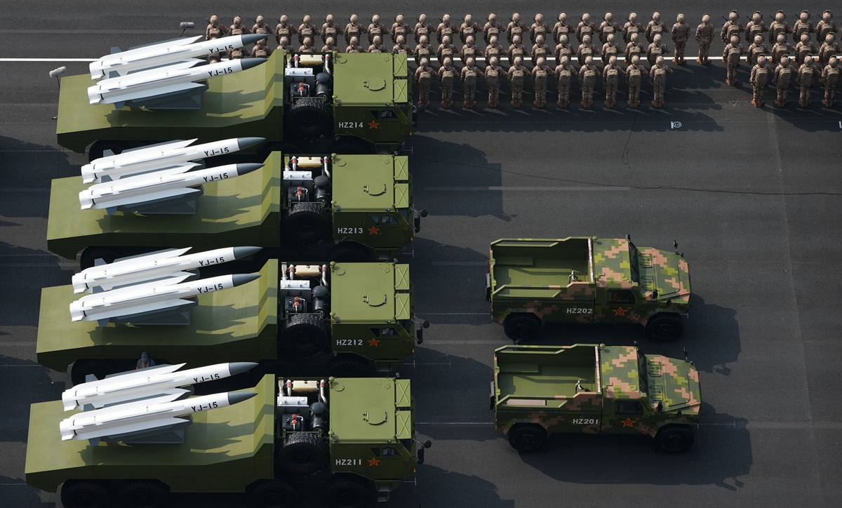 सैन्य परेडमा देखाइएका हातहतियारले चीनको रणनीतिक सोचमा परिवर्तन आइसकेको सन्देश दिएको छ । हाइपरसोनिक र अन्तर्महादेशीय क्षेप्यास्त्र, स्वचालित ड्रोनहरूको झुण्ड, अत्याधुनिक क्षेप्यास्त्र प्रतिरक्षा प्रणाली, समुद्रमुनि चल्ने ड्रोन लगायतका हतियारको प्रदर्शनी गरेर चीनले आफ्नो भूभाग नजिक शत्रुहरूले सैन्य कारवाही चलाउँदा विशाल क्षति बेहोर्नुपर्ने सन्देश दिएको छ । चीनका यिङची–१७, यिङची–१९ र यिङची–२० जस्ता जहाजनिरोधी हाइपरसोनिक क्षेप्यास्त्रहरूलाई अमेरिकाको विमानवाहक युद्धपोतको प्रोटोटाइपका विरुद्ध परीक्षण गरिसकिएको छ ।