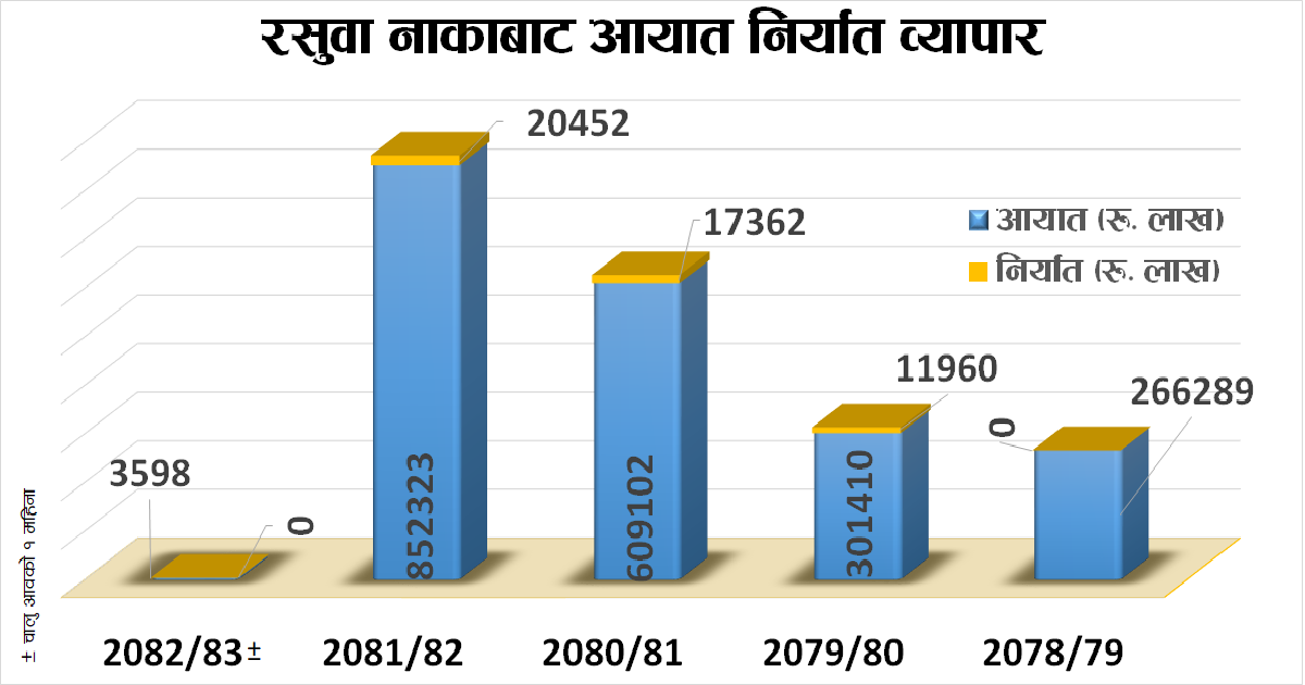 गत् आर्थिक वर्षमा रसुवा नाकामार्फत ८५ अर्ब २३ करोड २३ लाख रुपैयाँबराबरको विभिन्न मालसामान चीनबाट आयात भएको थियो भने २ अर्ब ५ करोड रुपैयाँबराबरको विभिन्न सामान नेपालबाट चीनमा निर्यात भएको छ ।