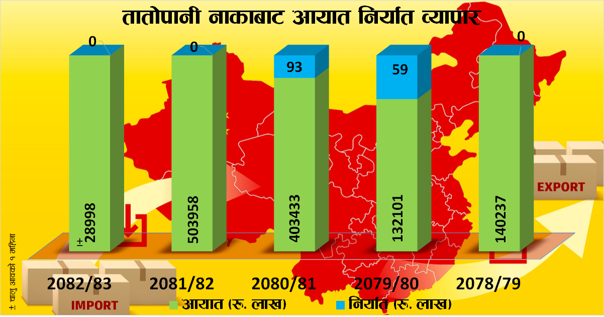 यहि अवधिमा तातोपानी नाकाबाट भने ५० अर्ब ३९ करोड ५८ लाख रुपैयाँबराबरको विभिन्न सामान भित्रिँदा नेपालबाट भने त्यो नाकामार्फत शुन्य परिमाणमा निर्यात भएको थियो ।