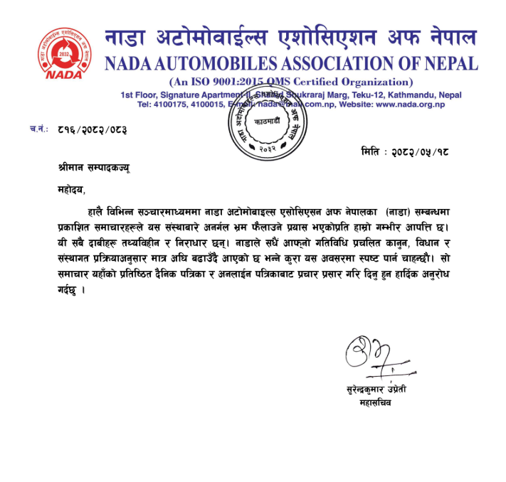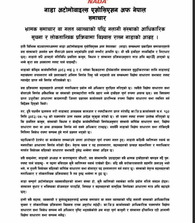 काठमाडौं । नाडा अटोमोबाइल्स एसोसिएसन अफ नेपालका (नाडा)ले भ्रामक समाचार वा गलत व्याख्याको पछि नलागी संस्थाको आधिकारिक सूचना र लोकतान्त्रिक प्रक्रियामा विश्वास राख्न आग्रह गरेको छ ।