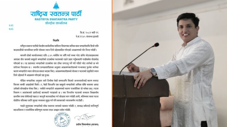 काठमाडौं । राष्ट्रिय स्वतन्त्र पार्टी (रास्वपा) ले आफ्ना केन्द्रीय नेतामाथि सांघातिक आक्रमण भएको भन्दै कारबाहीको माग गरेको छ।