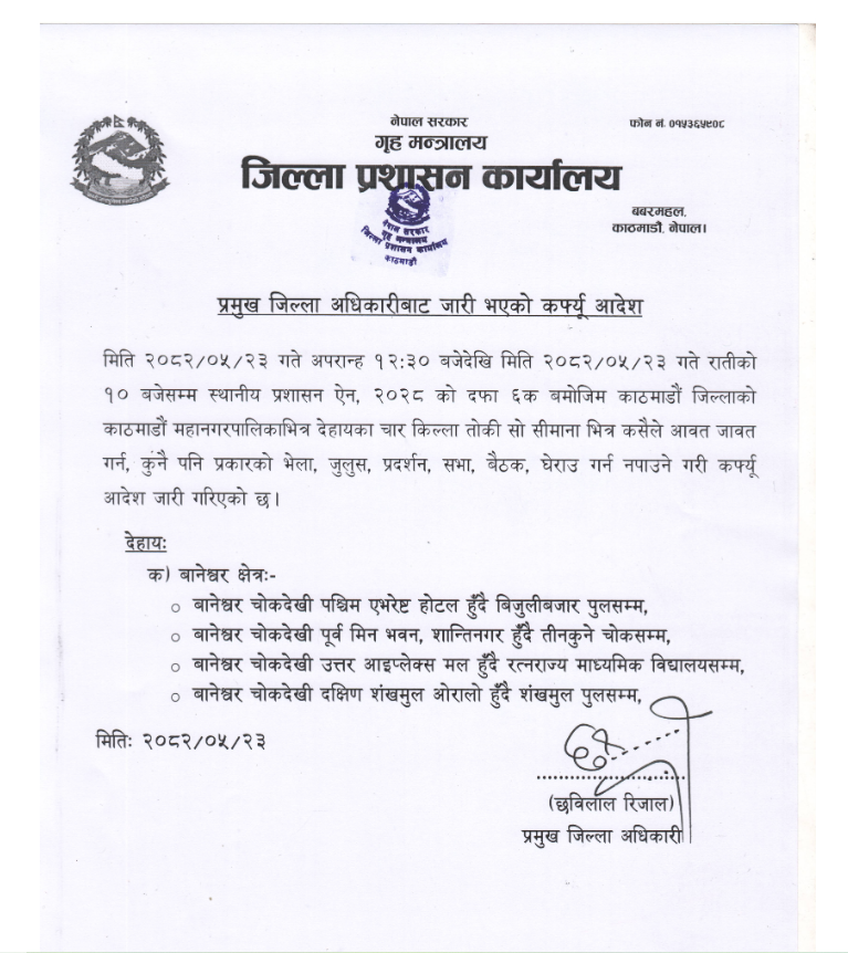 काठमाडौं । काठमाडौंमा कर्फ्यु लागेको छ । जेनजी पुस्ताले गरेको प्रदर्शन हिंसात्म बनेपछि काठमाडौंमा स्थानीय प्रशासनले कर्फ्यु लगाएको हो ।