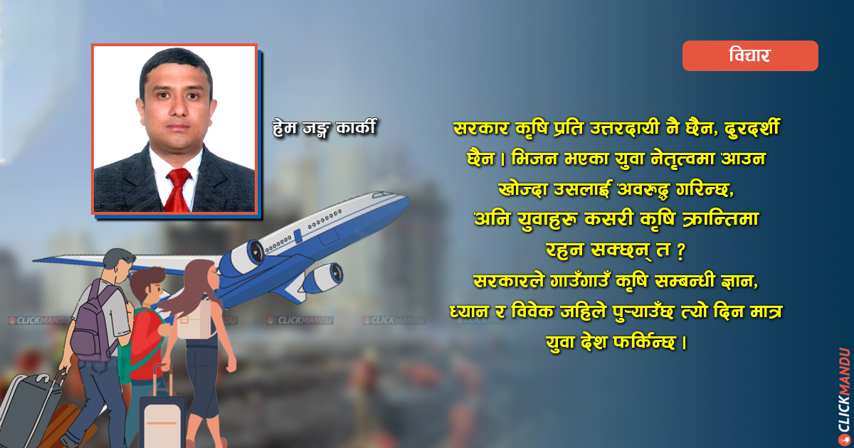 हाम्रो देशलाई कृषिप्रधान देश भनिएको छ । साँच्चिकै कृषिप्रधान देशमा युवा पलायनको अवस्था रहन्छ ? ठिकै छ, लौ कृषिप्रधान नै हो रे । कृषिप्रधान देश भएपछि कृषिका लागि गर्नुपर्ने र हुनु पर्ने व्यवस्था छ त ? छैन भने कसरी कृषिप्रधान मान्ने ? लौ कृषिप्रधान नै मानौ । तर, कृषिप्रधान भएपछि आफूले १ वर्ष जस्तो अवस्था आए पनि कहीँ कतै शीतयुद्ध भए पनि बाँच्न सक्ने अवस्था हुनपर्छ कि पर्दैन ? भन्ने कुरा सोचनीय छ । यति मात्र सोच्ने अवस्था आएको खण्डमा युवा बिदेसिनु पर्दैन । र, देशले आफ्नो अस्तित्वमा रहन सक्छ ।