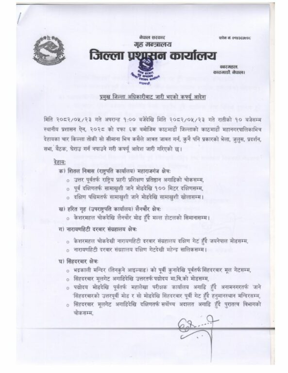 काठमाडौं । जिल्ला प्रशासन कार्यालय काठमाडौंले राष्ट्रपति कार्यालय शीतलनिवासक्षेत्र र सिंहदरबार क्षेत्रमा कर्फ्यु आदेश जारी गरेको छ ।