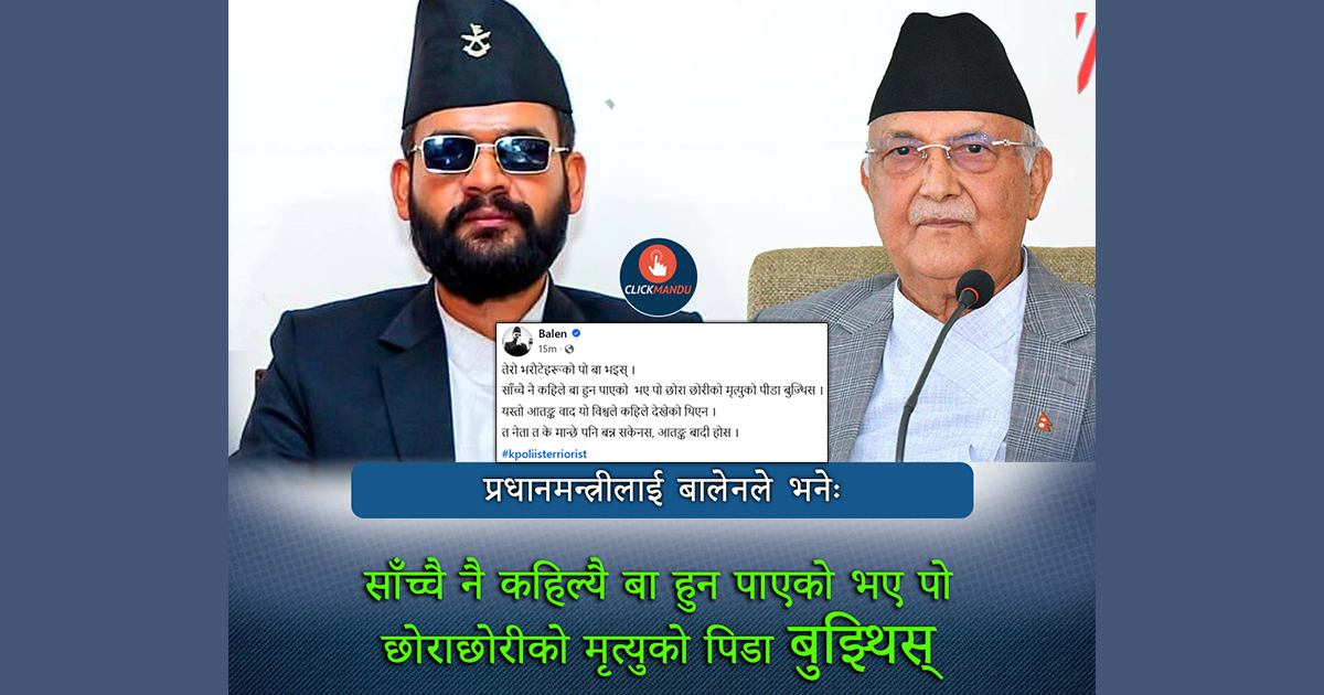 काठमाडौं । काठमाडौं महानगरपालिकाका मेयर बालेन शाहले प्रधानमन्त्री केपी शर्मा ओलीले कहिल्यै छोराछोरीका बुबा हुन नपाएकाले अरूका छोराछोरी मर्दाको पिडा थाहा नपाएको बताएका छन् । प्रधानमन्त्री ओलीमाथि अमर्यादित भाषामा फेसबुक स्ट्याटस लेख्दै बालेनले ओली भरौटेहरूको मात्र बा हुन सकेको आरोप लगाए ।