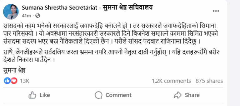 जेनजी प्रदर्शन बढ्दै गएपछि उनले राजीनामा दिने घोषणा गरेकी हुन् । ‘सांसदको काम भनेको सरकारलाई जवाफदेहि बनाउने हो ।