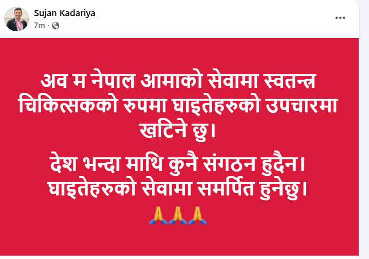 ‘विद्यार्थीहरूको हक, अधिकार र भविष्यको संरक्षक, पथ प्रदर्शक विद्यार्थी संगठनहरुले आज स्कूले पोशाकमा रहेको विद्यार्थीको प्राण रक्षा समेत गर्न सकेन,’ कडरियाले लेखेका छन् ।