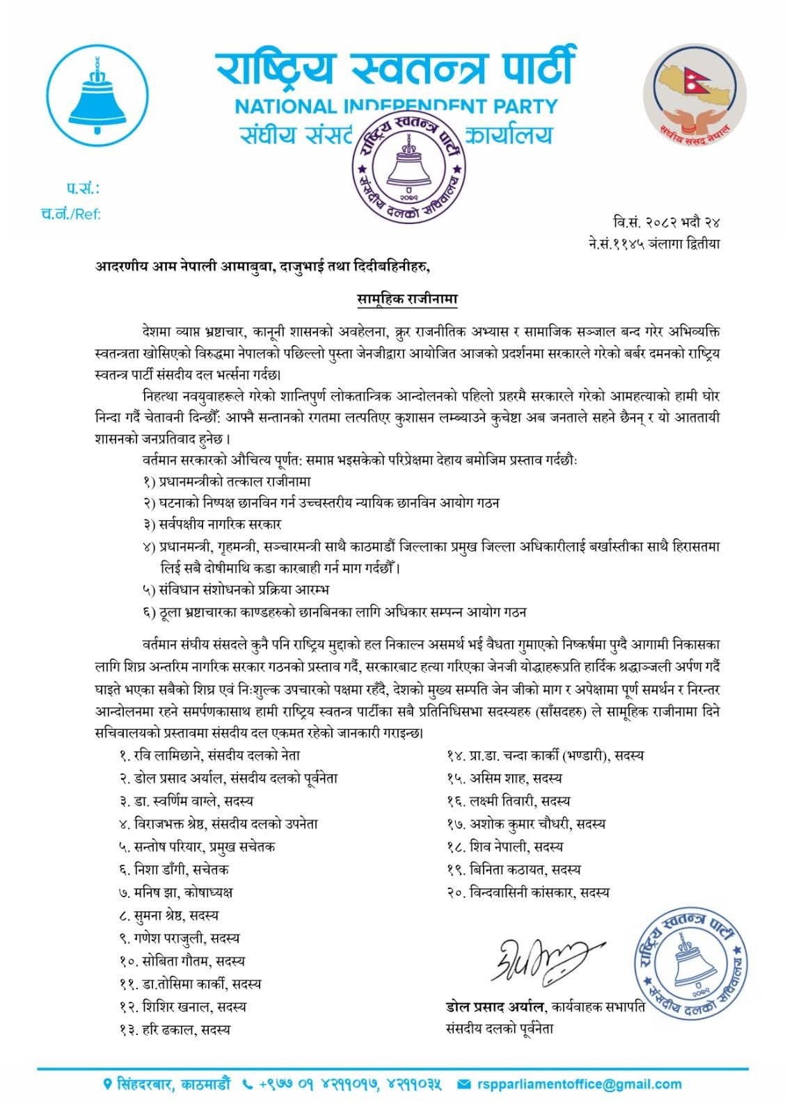 काठमाडौं । राष्ट्रिय स्वतन्त्र पार्टीका सबै सांसदले सामूहिक राजीनामा दिएका छन् ।
