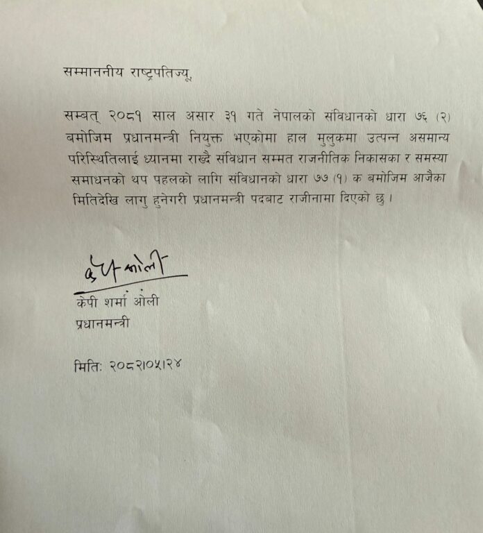 सम्बत् २०८१ साल असार ३१ गते नेपालको संविधानको धारा ७६ (२) बमोजिम प्रधानमन्त्री नियुक्त भएकोमा हाल मुलुकमा उत्पन्न असमान्य परिस्थितिलाई ध्यानमा राख्दै संविधान सम्मत राजनीतिक निकासका र समस्या समाधनको थप पहलको लागि संविधानको धारा ७७ (१) क बमोजिम आजैका मितिदेखि लागु हुनेगरी प्रधानमन्त्री पदबाट राजीनामा दिएको छु ।