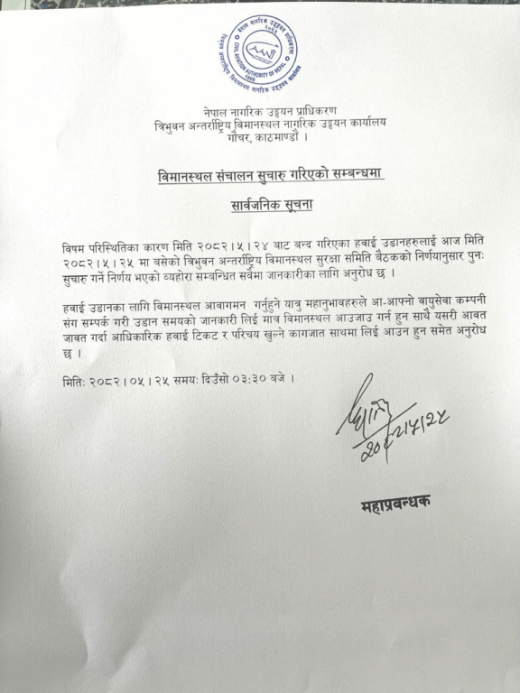 काठमाडौं । मंगलबार दिउसोदेखि बन्द त्रिभुवन अन्तर्राष्ट्रिय विमानस्थल खुला भएकाे छ । विमानस्थल खुला भएसँगै बुधबार साँझदेखि उडान सञ्चालनमा आउन सक्ने भएको छ । त्रिभुवन अन्तर्राष्ट्रिय विमानस्थलका प्रवक्ता रिन्जी शोर्पाका अनुसार हिजोदेखि बन्द विमानस्थल खुलेकाे छ ।