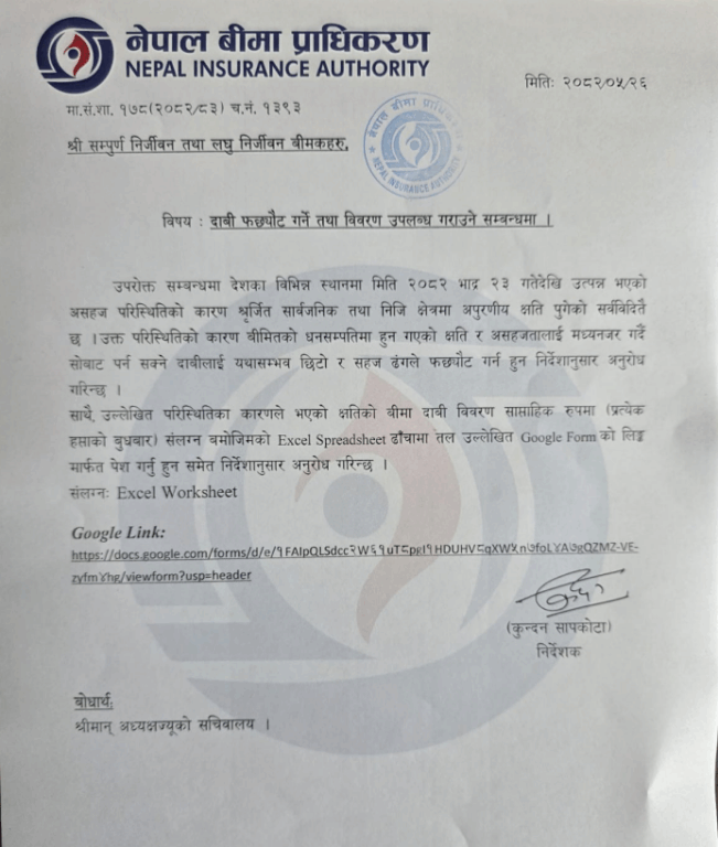 साथै, उल्लेखित परिस्थितिका कारणले भएको क्षतिको बिमा दाबी विवरण साप्ताहिक रुपमा (प्रत्येक हप्ताको बुधबार) पेस गर्न समेत प्राधिकरणले आग्रह गरेको छ ।