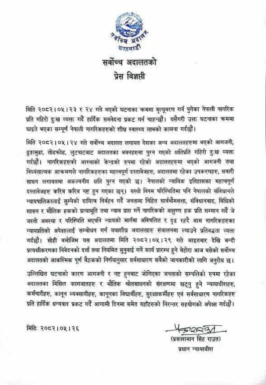 सर्वोच्च अदालतका प्रधानन्यायाधीश प्रकाशमान सिंह राउतले जारी गरेको बिज्ञप्तीमा जेनजी प्रदर्शनको क्रममा नेपालको न्यायिक इतिहासका महत्वपूर्ण दस्तावेजहरु नष्ट भएको उल्लेख छ ।