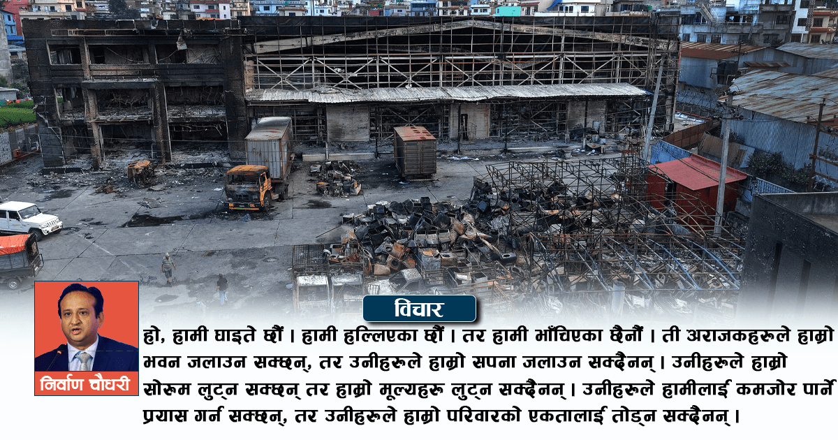 पछिल्ला केही दिन हाम्रो कम्पनीको इतिहासका सबैभन्दा पीडादायी दिनहरू बनेका छन् । जवाफदेहीपन र परिवर्तनको माग गर्दै सुरु भएको युवाहरूको आन्दोलनको उद्देश्य राम्रो थियो तर अराजक तत्व र बाह्य शक्तिहरूद्वारा विकृत र अपहरण गरियो। शान्तिपूर्ण ढंगले समृद्ध नेपालको आह्वान हुनुपर्ने कुरा हिंसा, लुटपाट र विनाशमा परिणत भयो । हामीले आश्चर्यमा पार्ने क्रूरता देख्यौं । हाम्रो … Continue reading सिजी परिवारलाई निर्वाणको पत्र: अराजक आक्रमणले भवन जले पनि सपना जिउँदै छन्, अझै बलियो हुनेछौं