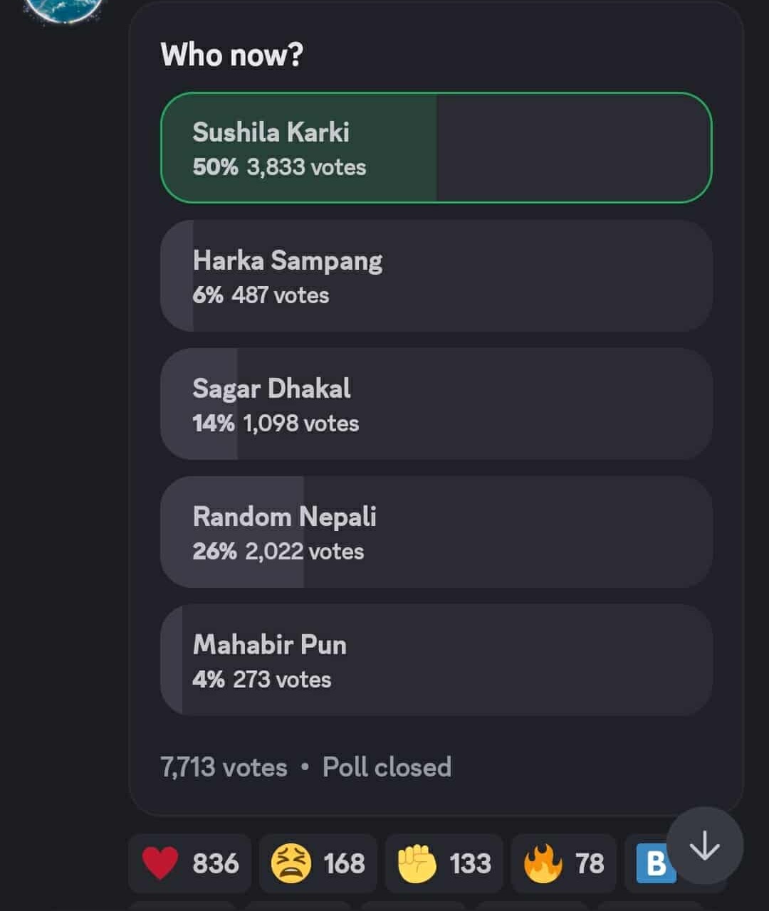 अनलाइन मतदानमा पूर्वप्रधानन्याधीश सुशीला कार्कीले सबैभन्दा बढी मत प्राप्त गरिन् । यस प्रक्रियामा काठमाडौं महानगर प्रमुख बालेन शाह भने मौन देखिए । उनी जेनजीको सम्पर्कमा नआएपछि उनी सूचीमा रहेनन् र पछि सामाजिक सञ्जालमार्फत बालेनले सुशीलालाई समर्थन जनाए ।