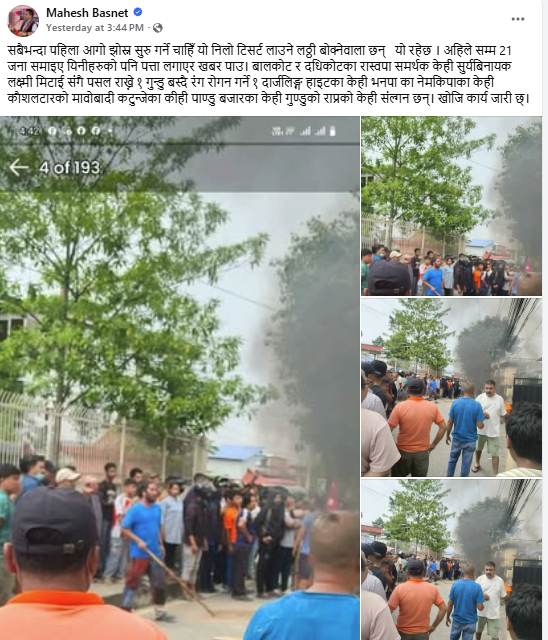 ‘मेरो घरमा आगो लाउने मुख्य लिडर यो निलो सर्ट लाउने केटो दिपक बिक भन्ने रहेछ । यसको घर जाजरकोट रहेछ । यो भक्तपुरमा कोठा गरी बस्दो रहेछ,’ बस्नेतले लेखेका छन्, ‘अहिले यसको कोठा बन्द छ । अहिले भागेर घर जान खोज्दै रहेछ। बसपार्क क्षेत्रमा छ भन्ने सूचना आयो साथीहरुले तुरुन्तै यसलाई समातेर प्रहरीकोमा बुझाइदिनु ।’