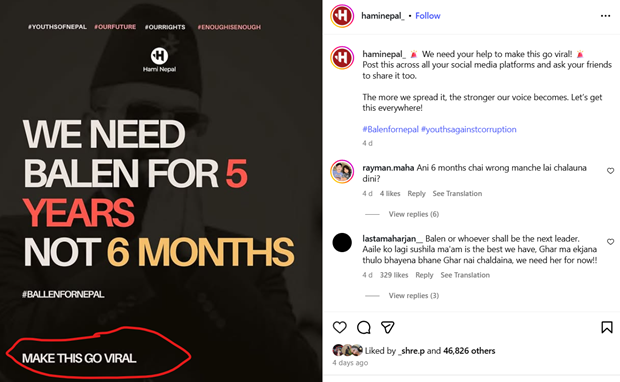यता अर्को युवा जमात थियो जो काठमाडौं महानगरपालिकाका ड्यासिङ मेयर बालेनलाई प्रधानमन्त्रीको रुपमा देख्न चाहन्थ्यो । उनीहरुको भावनालाई बालेन प्रधानमन्त्री बन्न चाहेनन् भन्ने सन्देश पठाएर मारियो ।