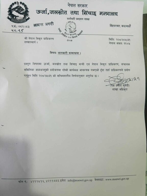 ‘ऊर्जा, जलस्रोत तथा सिंचाइ मन्त्री एवं नेपाल विद्युत प्राधिकरण, सञ्चालक समितिका अध्यक्षज्यूको प्रयोजनमा रहेको कार्यकक्ष आवश्यक नभएको हुँदा तहाँ प्राधिकरणले प्रयोग गर्नुहुन भदौ ३१ को सचिवस्तरीय निर्णयानुसार अनुरोध छ,’ मन्त्रालयले जारी गरिएको पत्रमा भनिएको छ ।