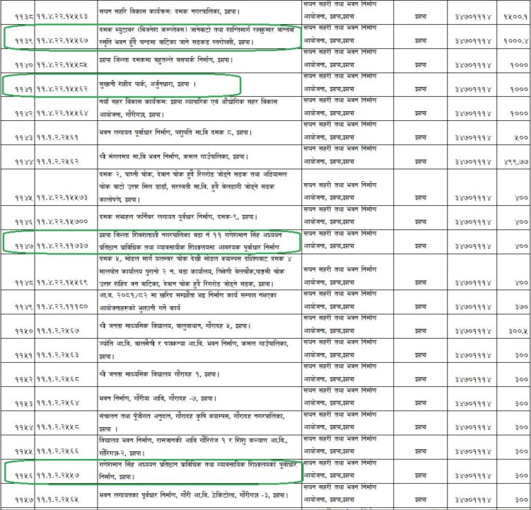 रातो कितावमा बजेट उपशीर्षक नम्बर ३३०११८३ मा सूचीकृत गरी ११ योजनामध्ये ३ करोडको तीन योजना, ४ करोडको ५ योजना, १० करोडको दुई र २० करोड बजेट भएको एक योजना झापाको दमक र गौरादह केन्द्रित छन् ।